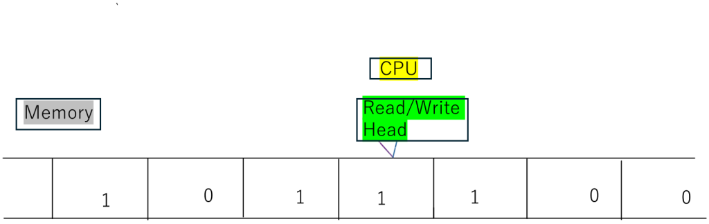 図1を見てください。データ(プログラムもデータの一部)を一次元のテープメモリの中に保存する。データは、シンボル(記号)の集まりです。メモリーからデータを取り出すヘッド(左右に自由に移動できる)と取り出したデータを加工する制御部(演算部、CPU)を持つという簡単な仮想装置を考えました。